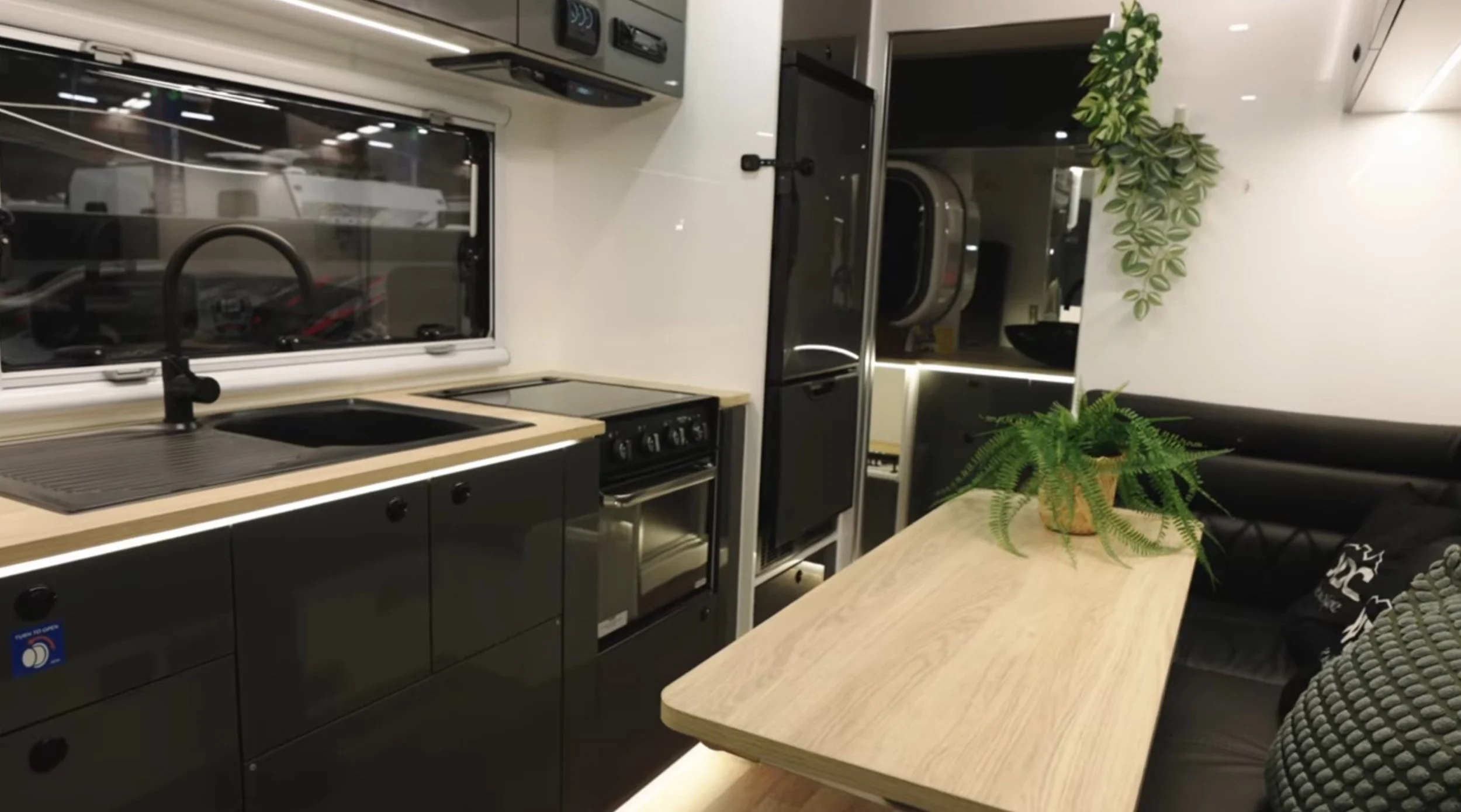 ♦ Internal modern oak timber style laminated bench & counter tops with black matte finished washboard sink & tapware