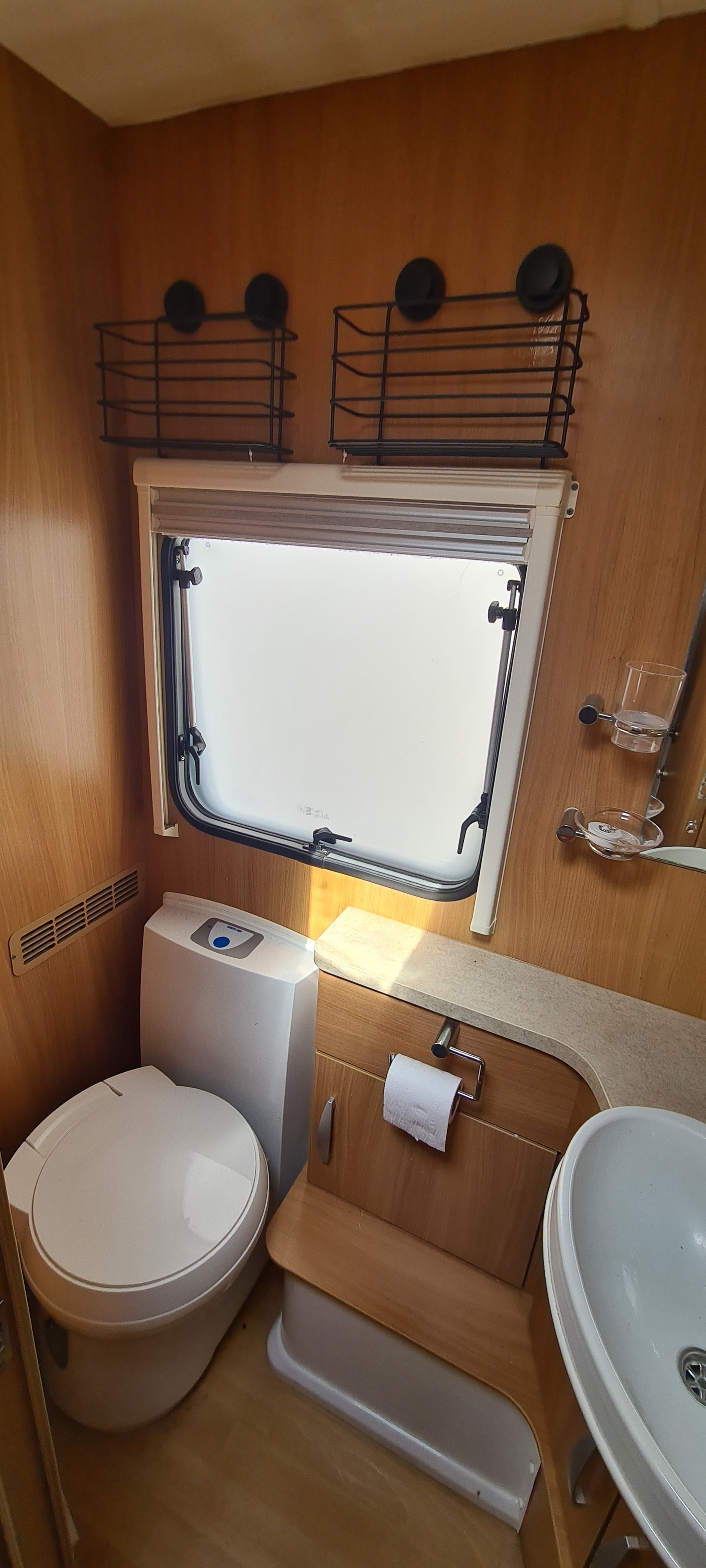 = Bathroom has Thetford cassette toilet and hand basin. Spare cassette included.